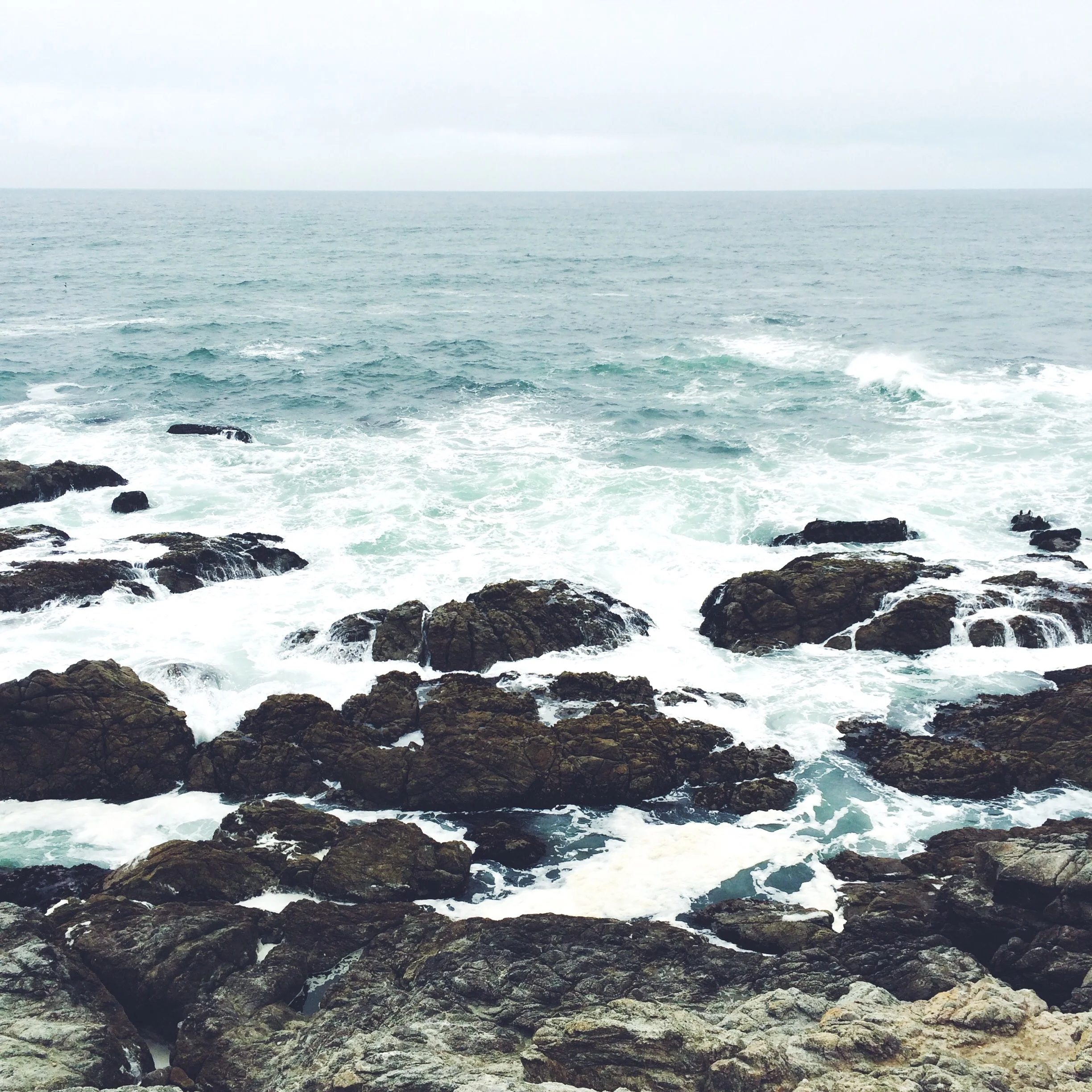 [Photo of the ocean with the horizon in the background and waves breaking over large rocks in the foreground. Photo by Mia Mingus.]